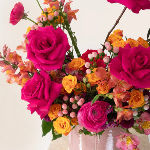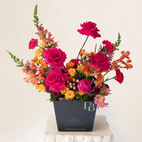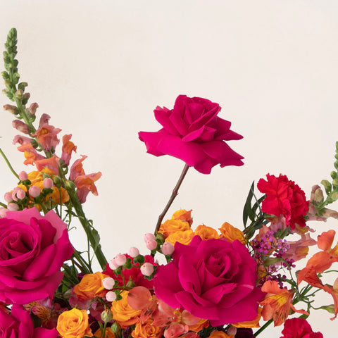 The Garnet arrangement glows with coral sunset tones, accented by bold pops of hot pink and orange. A vibrant statement for warm, celebratory moments.