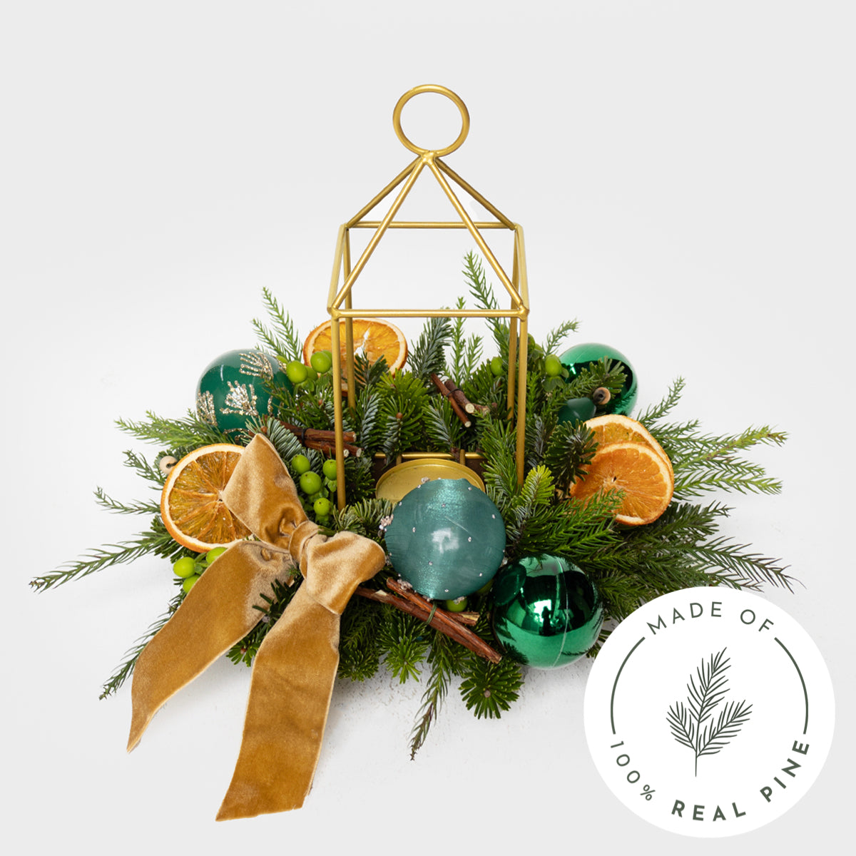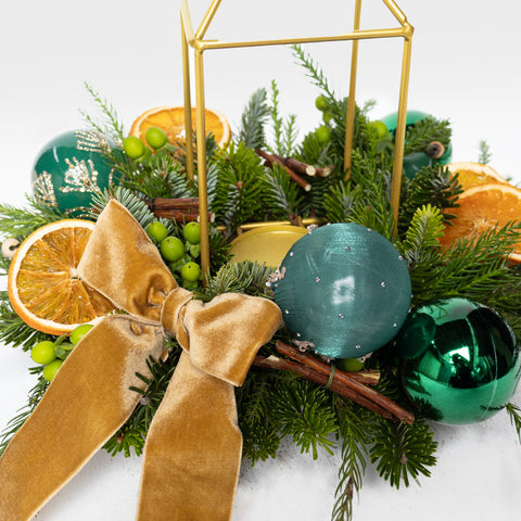Lush greens and warm golden tones come together in timeless harmony, capturing the charm and nostalgia of Christmas past. This candle centerpiece arrangement from the Vintage Evergreen Collection brings a fresh yet classic touch to your holiday décor and celebrations.