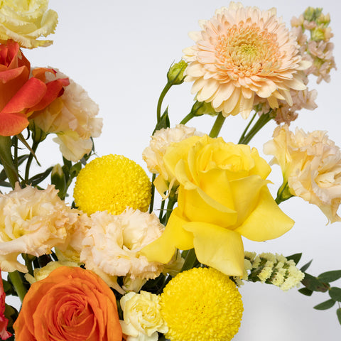 Where color meets sophistication, combines golden hues, apricot tones, and creamy florals in an arrangement that radiates modern charm and elegance.