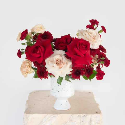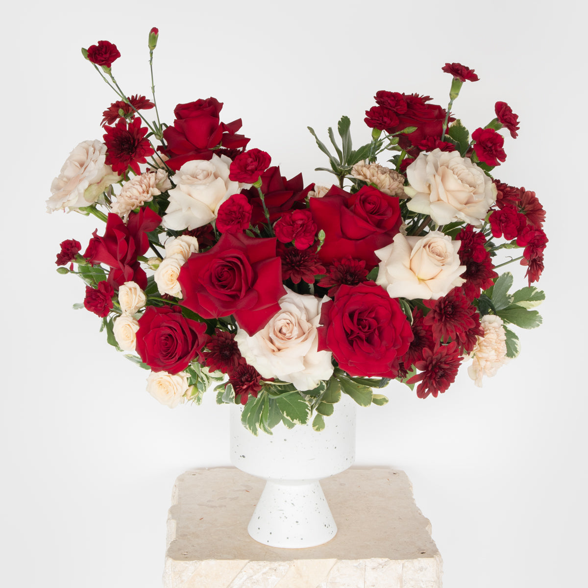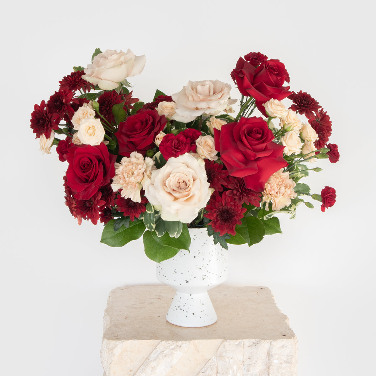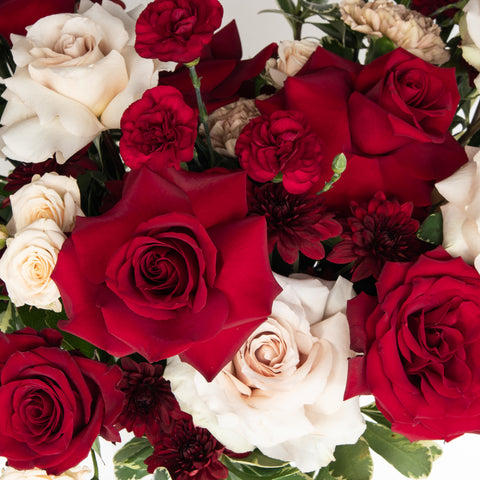 Graceful and opulent, the Roma Arrangement is a stunning expression of timeless beauty. A curated blend of deep crimson roses, soft blush and ivory blooms, and rich burgundy carnations come together in perfect harmony, accented with delicate spray chrysanthemums and lush foliage.