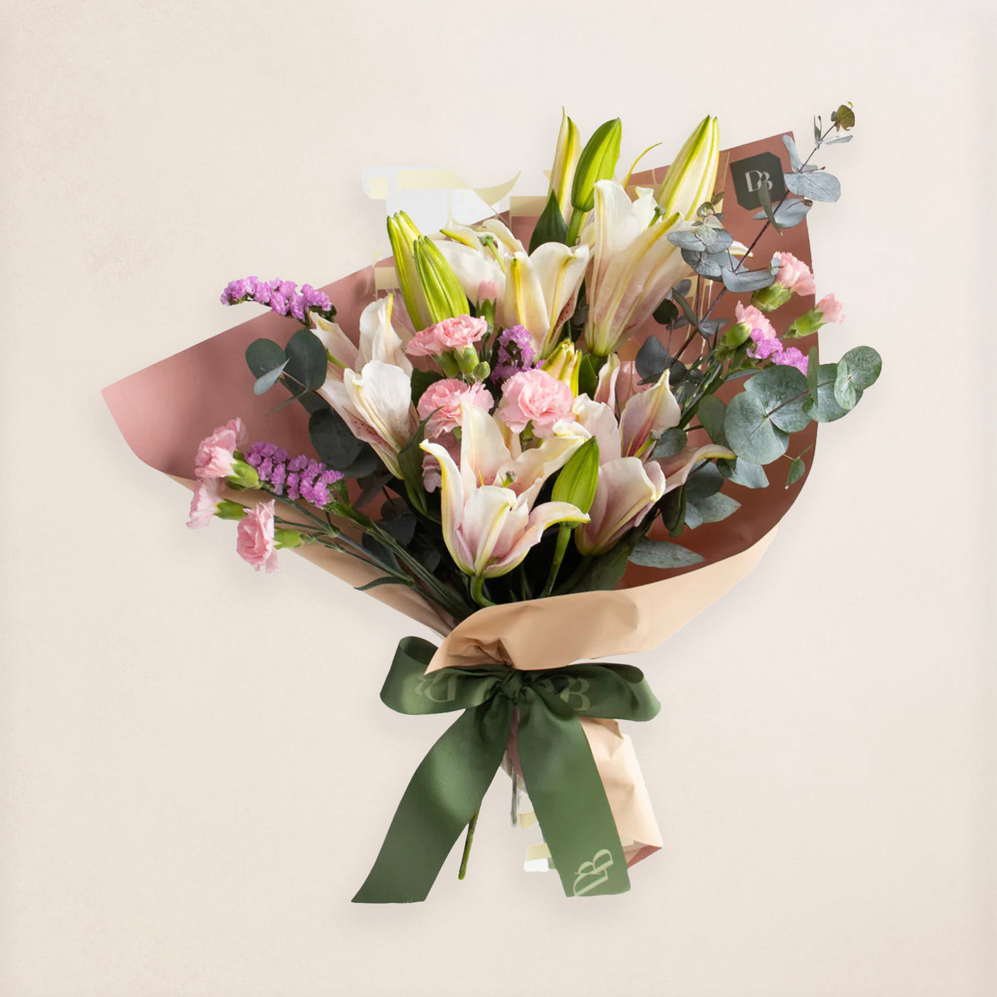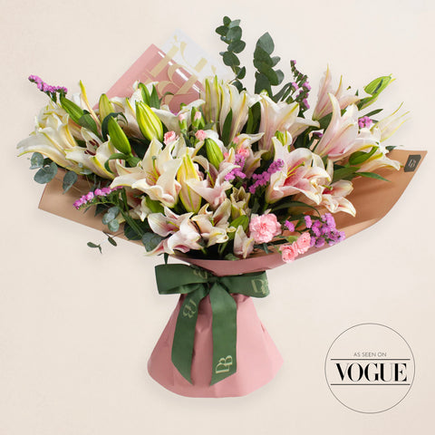 Wrapped elegance shines through with sweet-scented lilies. Symbolic of love, rebirth, and abundance.