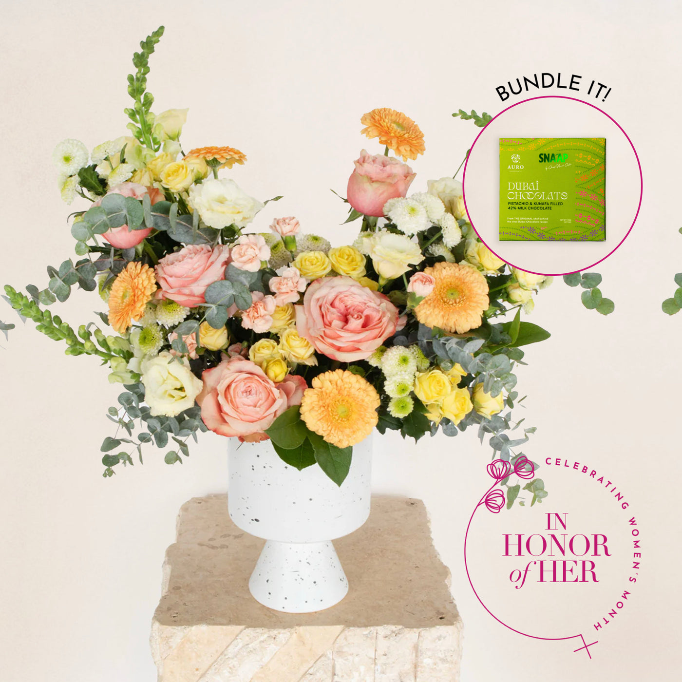 A thoughtful pairing of fresh blooms and indulgent flavor. This bundle brings together our Devon Arrangement with the Auro x SNA’AP Dubai Chocolate Pistachio Kunafa, a rich, layered treat of chocolate and pistachio wrapped in crisp, golden strands.