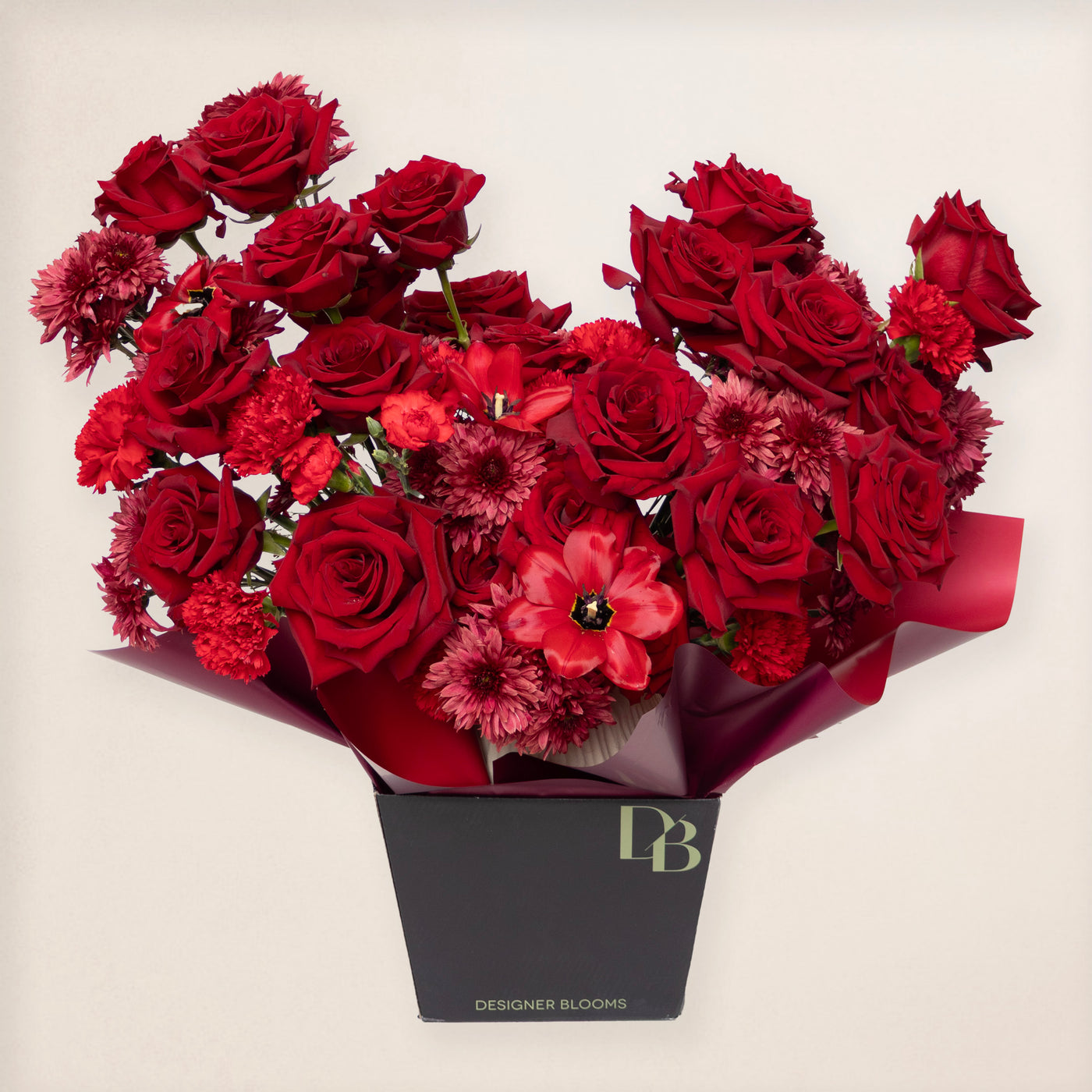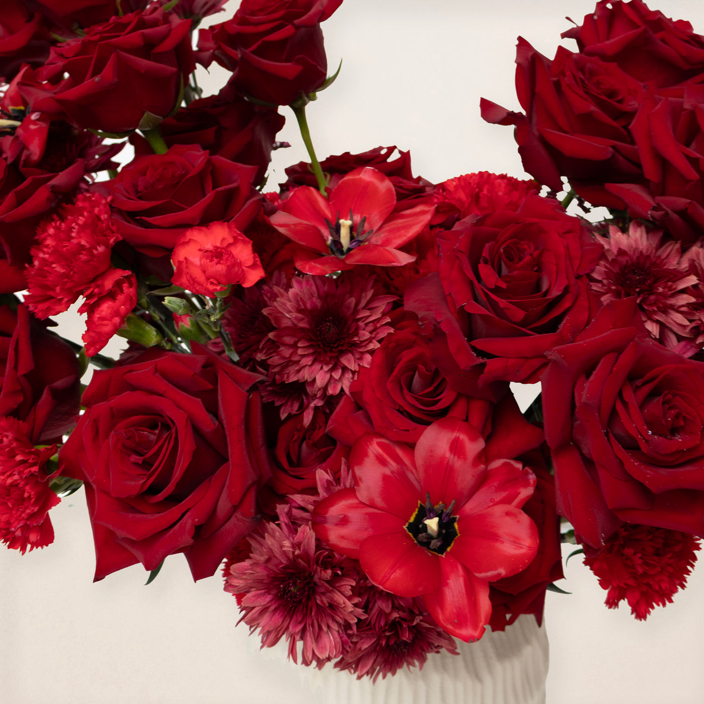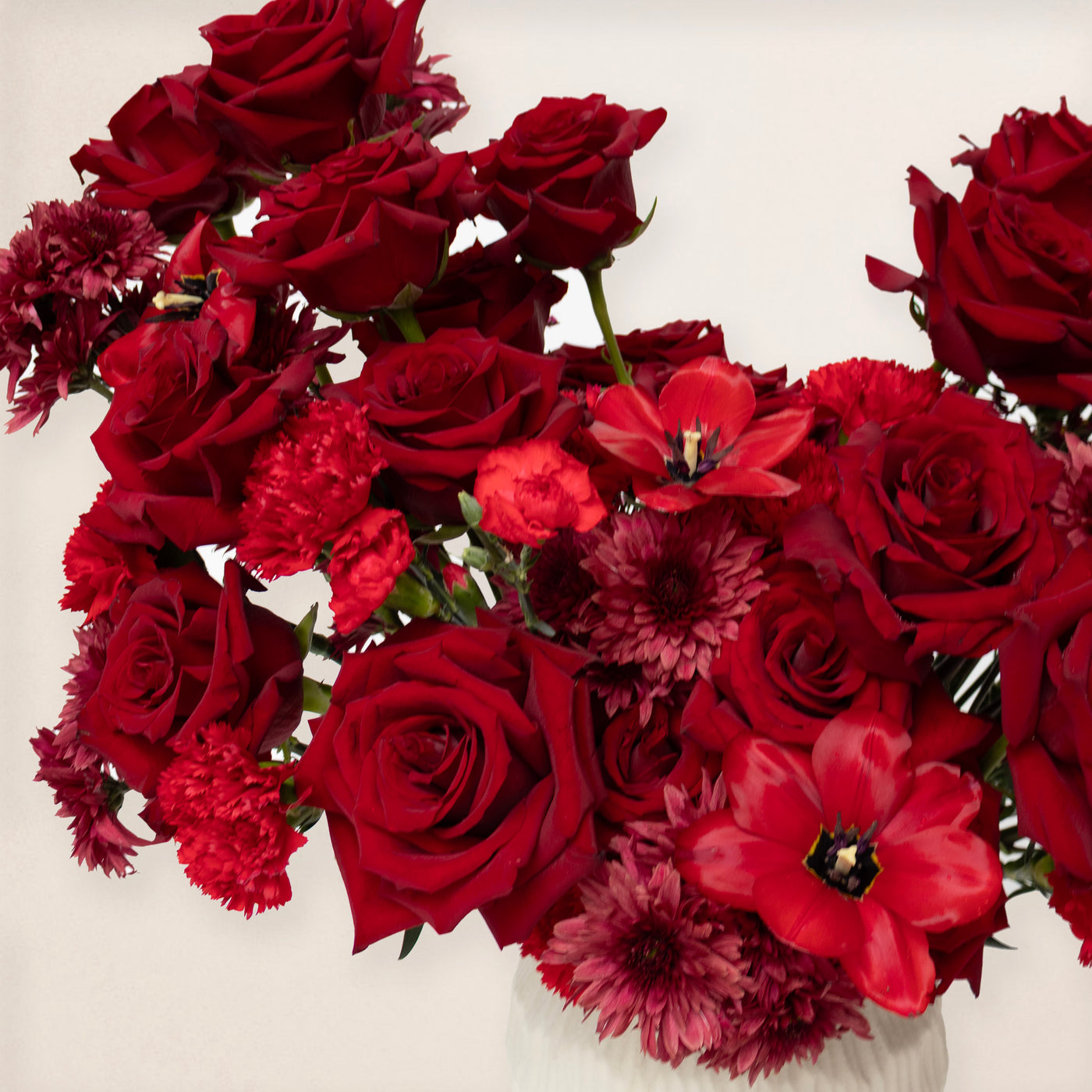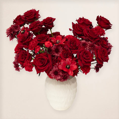 A striking arrangement of lush red blooms set in a sculptural large vase. Bold, full, and refined, this piece commands attention and brings a sense of quiet luxury to any space.