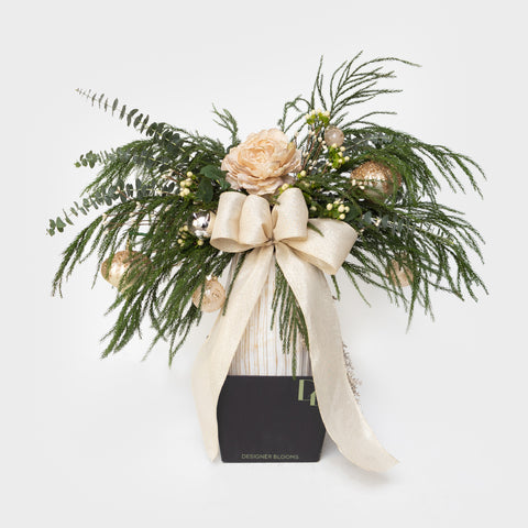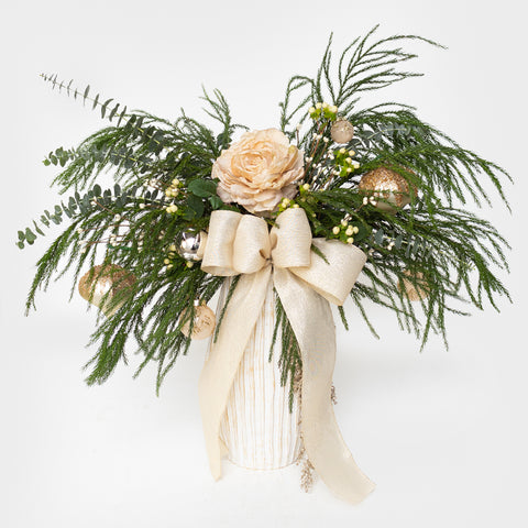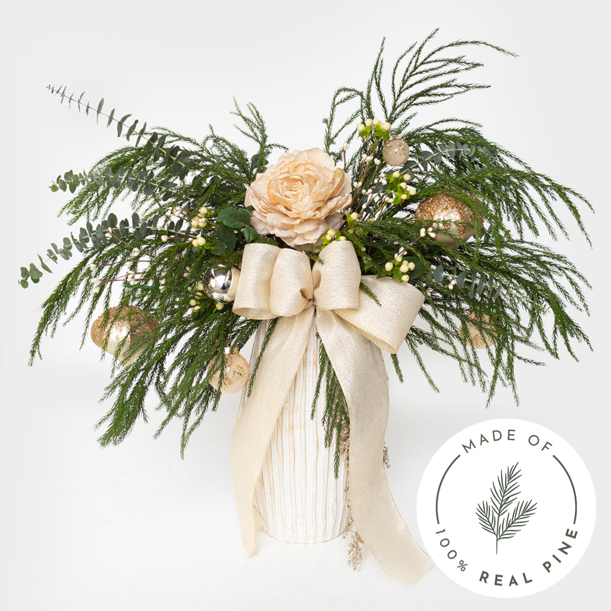 Soft gold tones and fresh evergreens come together in radiant simplicity, bringing warmth and quiet elegance to your holiday celebrations. This tall vase arrangement from the Gilded Simplicity Collection is the perfect addition to your holiday décor and gatherings.