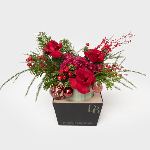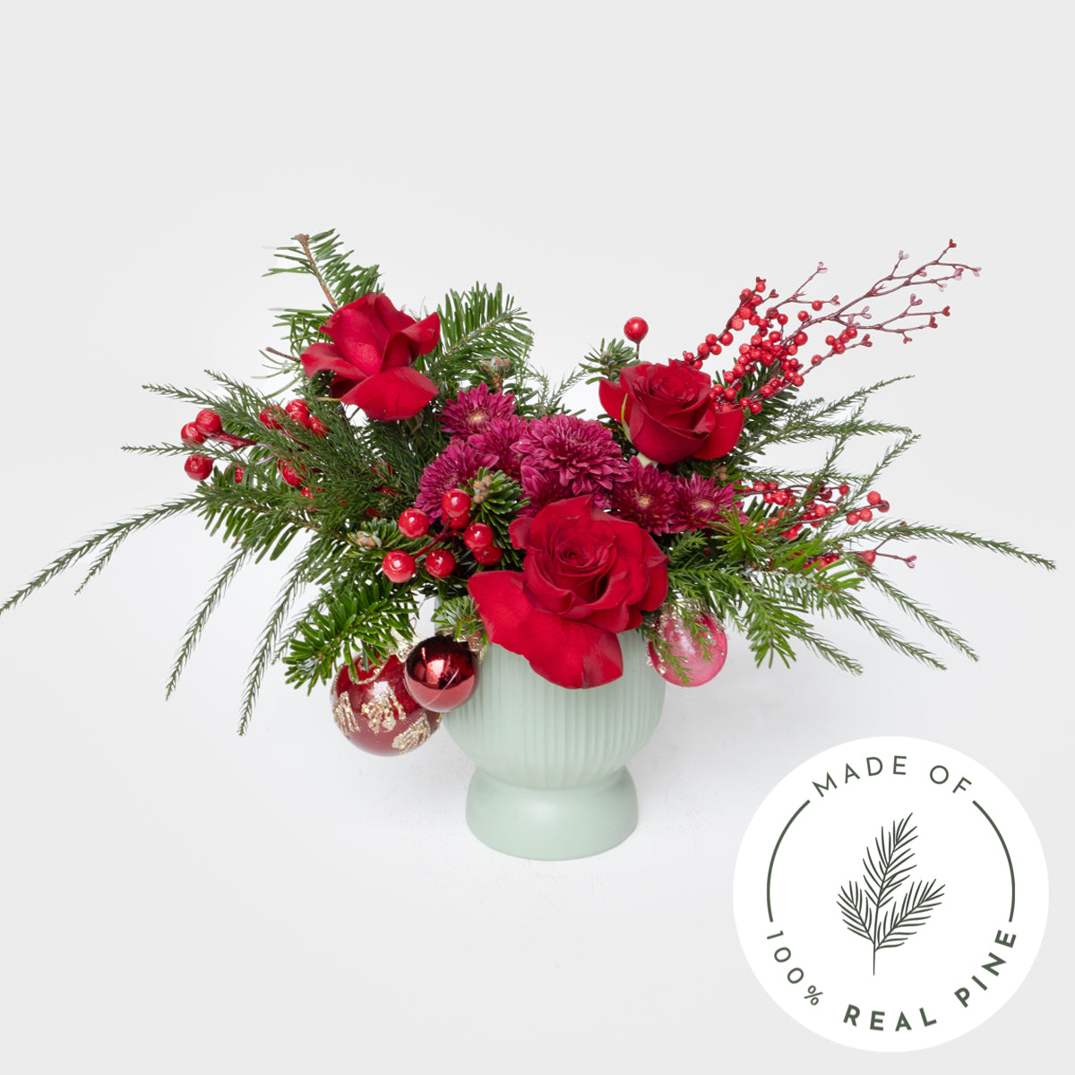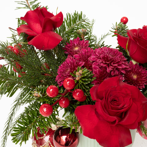 Deep crimson tones and lush greenery come together in elegant harmony, bringing festive romance and classic luxury to every space. This vase arrangement from the Red Reverie Collection is the perfect addition to your holiday décor and gatherings.